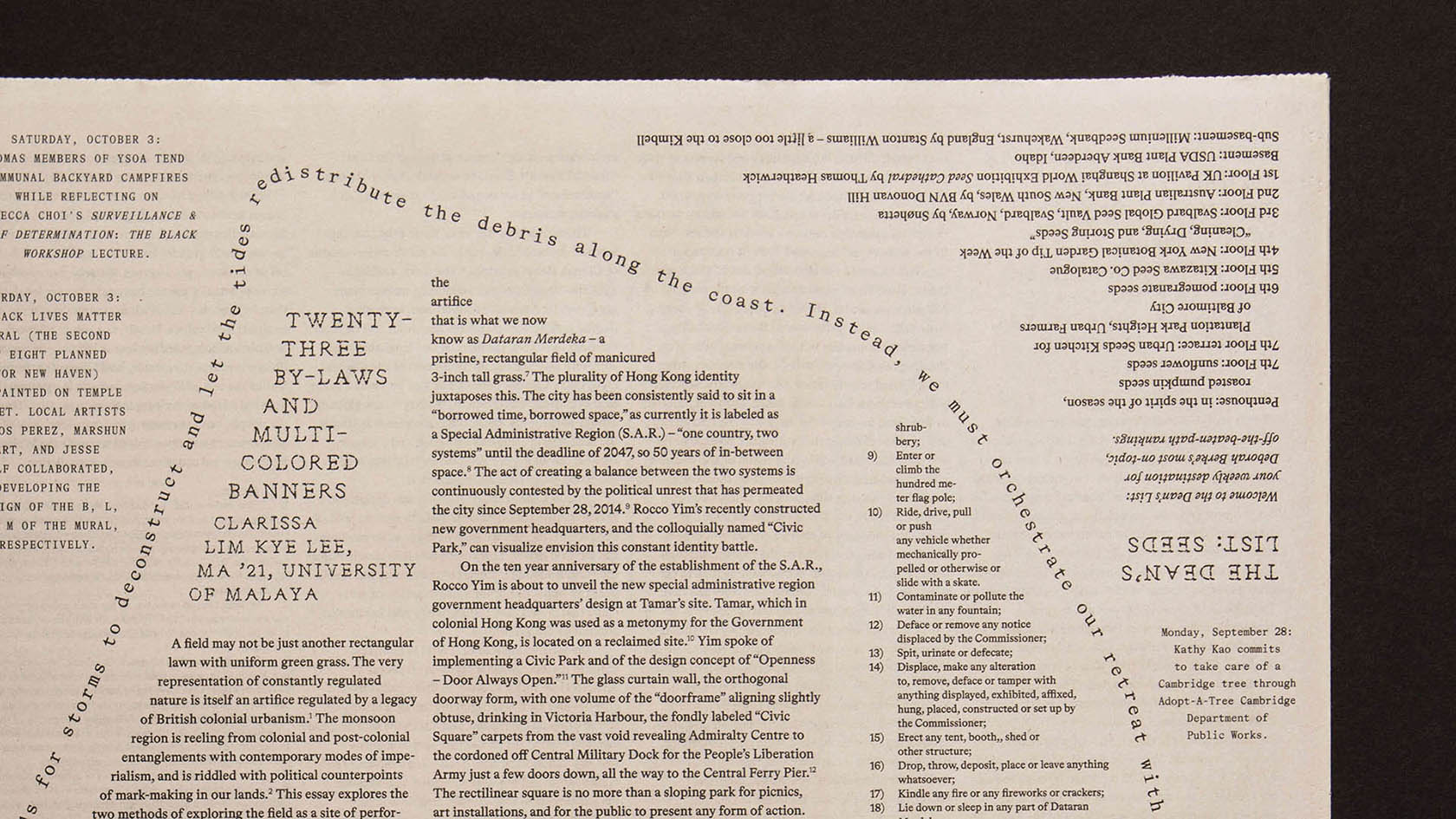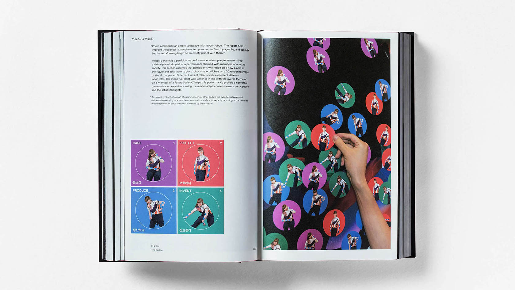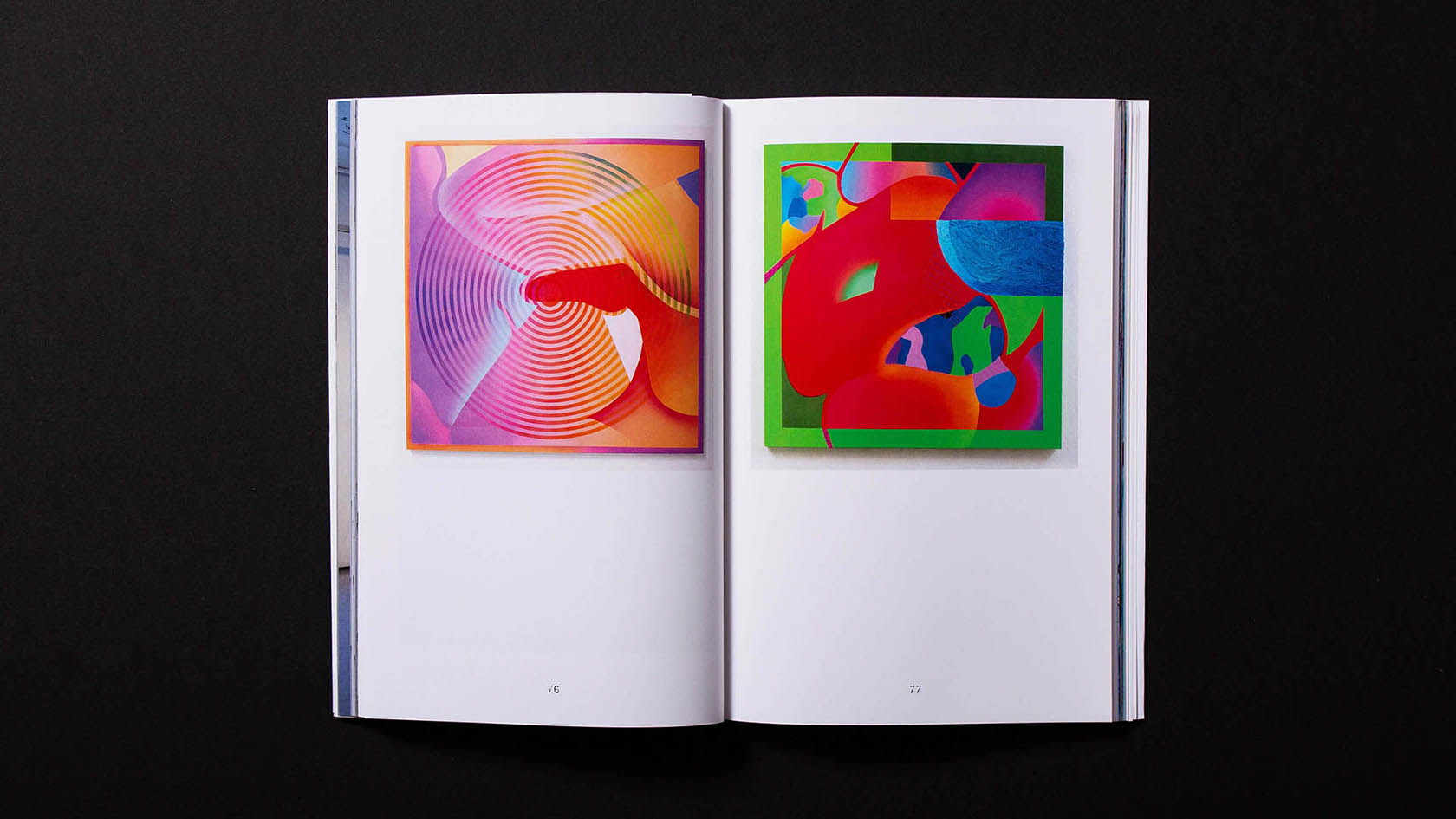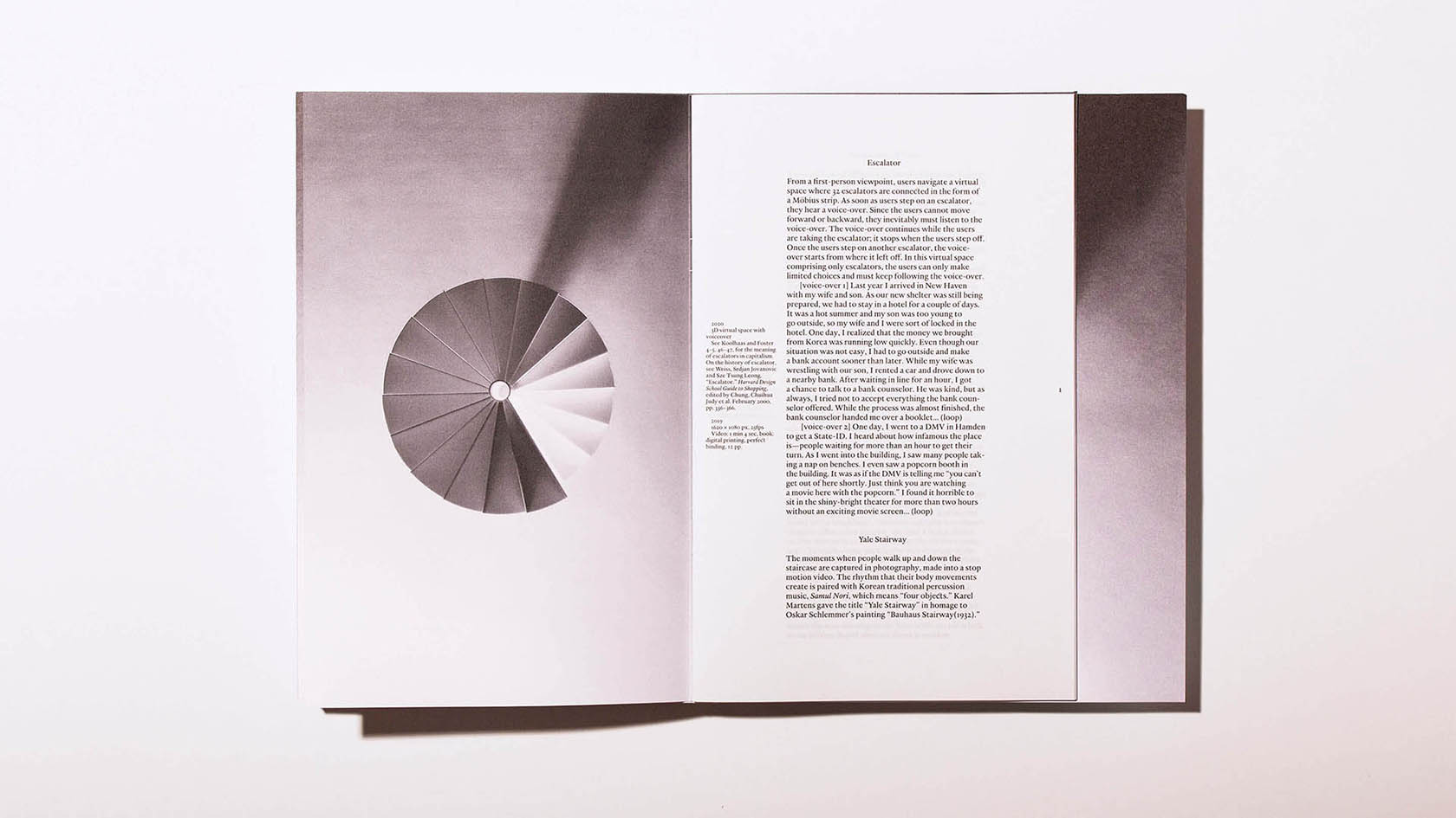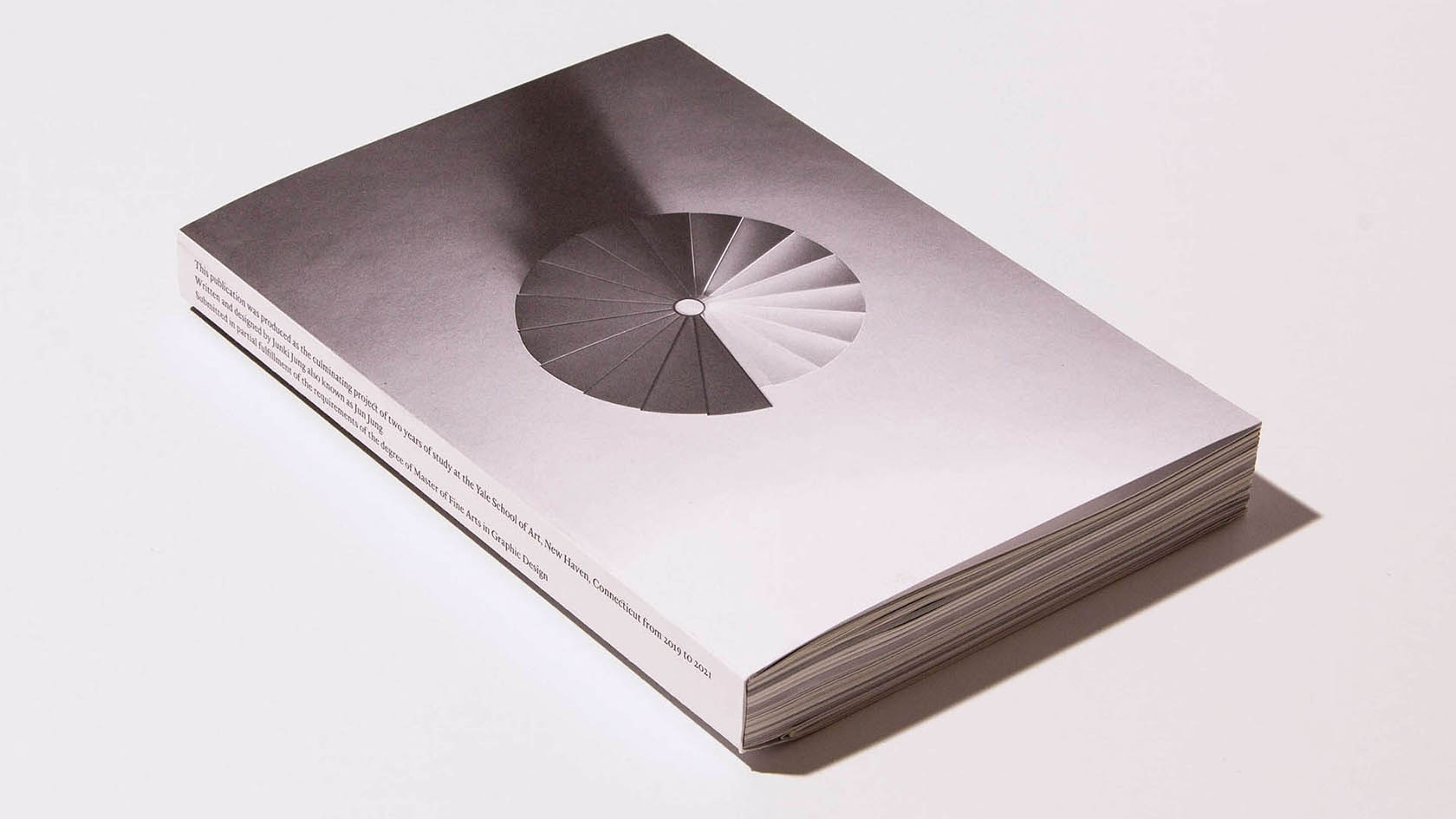 A compilation of projects created during a 2-year MFA program in Graphic Design at the Yale School of Art. Aesthetics found in the process of slow observations is embodied in a variety of mediums: typography, website, book, and video. An autobiographical essay is interspersed between images of the projects. From the front cover to the back cover, twelve images of the project, Spinning Wheel (see no.13), are laid out.